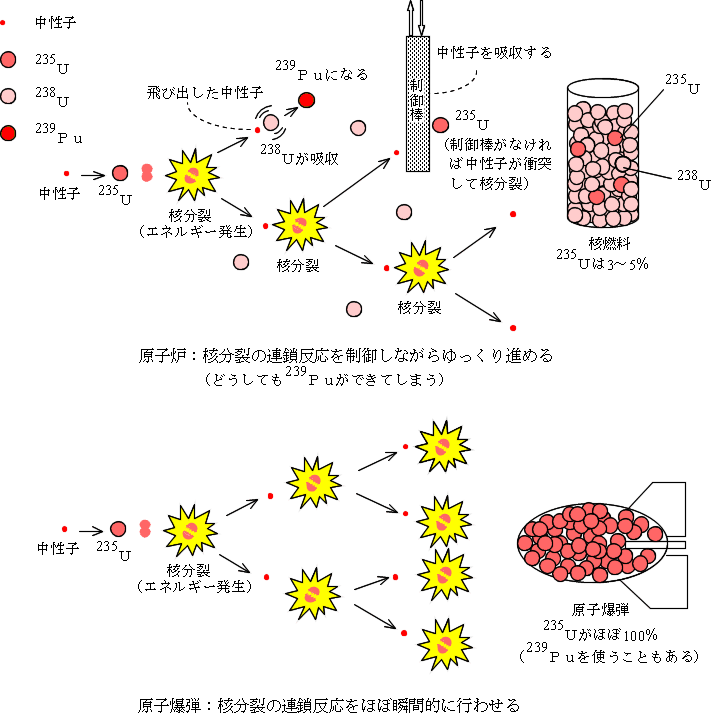 原子爆弾は90%以上に濃縮したウランに対し核分裂を制御することなく瞬時に反応することにより莫大なエネルギーを放出させます。