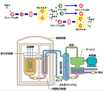 西欧の主要国が技術的・経済的困難などを理由に高速増殖炉から撤退する中で、日本のみが「原子力の平和利用の牽引国の役割を果たす」と豪語して開発に固執しました。しかし、原型炉「もんじゅ」は1995年12月のナトリウム流出・火災事故(右図の2次主冷却系ナトリウム漏えい)で、運転停止に追い込まれました。運転再開のための本体工事が2007年に完了し、2010年5月6日に2年後の本格運転を目指して運転を再開。しかし、2010年8月の炉内中継装置落下事故により、再び停止。2012年11月に立ち入り検査した原子力規制庁は、4万9千点近くある機器の約1万点の点検期間設定の不適切を指摘。2013年規制委から運転停止命令を受け、原子力関係閣僚会議が廃炉を決定(2016年)しました。こうして高速増殖炉開発は破綻しました。