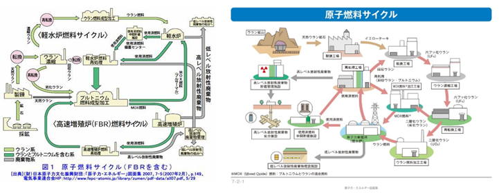 出典:原子力文化財団「原子力・エネルギー」図面集 「原子燃料サイクル」 左:FBR有(2007年2月版) 右:FBR無(2016年3月14日)