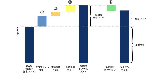 統合コストの概念図 (参考: F. Ueckerdt氏らの論文を基に安田氏日本語訳。①〜④は筆者の追記で原図にはない)