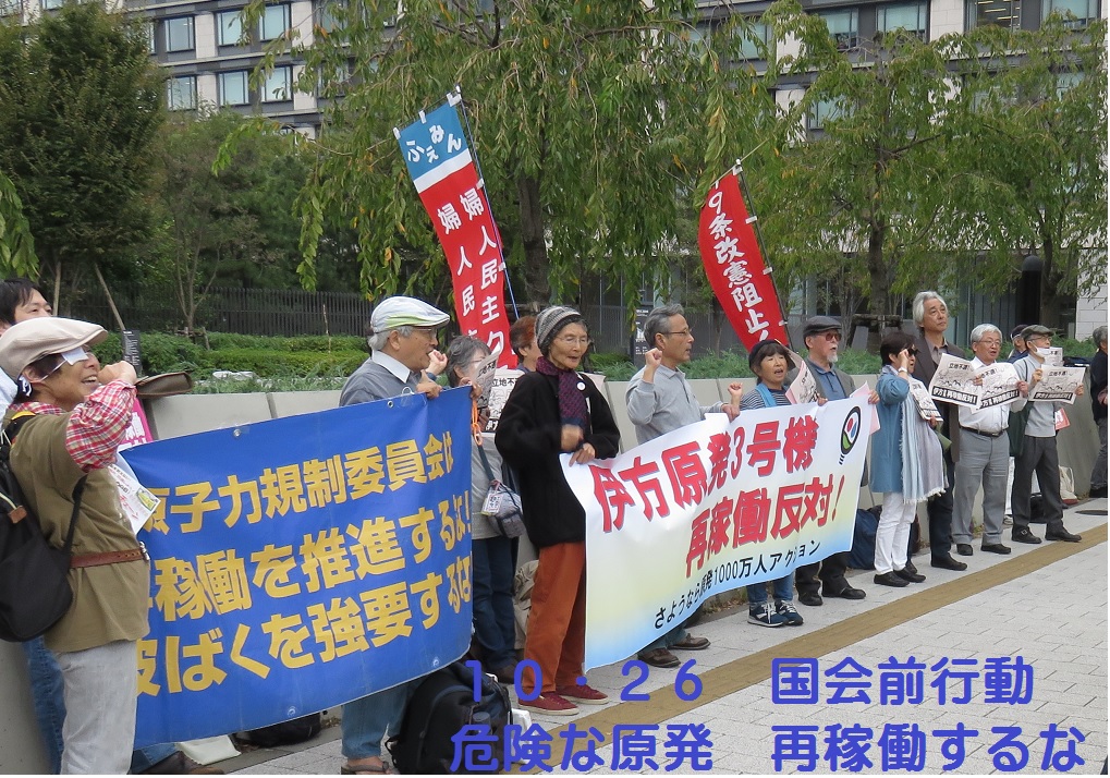 10月26日、「さよなら原発1000万人アクション実行委員会」は、国会前で「伊方原発3号機の再稼働反対 危険な原発を動かすな」の抗議行動を、衆議院第二議員会館前でおこないました。