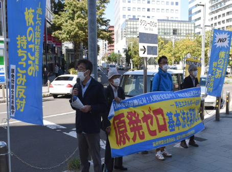 11月11日、北海道では岸田政権のもとで初めてのイレブンアクションを実施しました。福島第一原発事故を繰り返させないために横断幕とのぼり旗を掲げて、リレートークで訴えました。