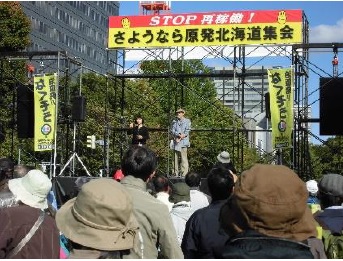 さよなら原発1000万人アクション北海道実行委員会主催の「さよなら原発北海道集会」が、10月6日午後、札幌市大通公園西八丁目広場で開催されました。北海道各地から労働組合員、脱原発を求める諸団体、多くの市民など1500人が参加しました。