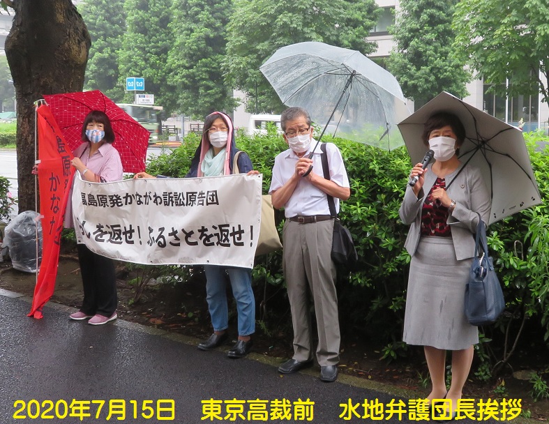 小雨が降る中で裁判所前集会が開かれ、支援者、水地啓子弁護団長、村田弘原告団長らが支援の訴えをした。「第一陣の仙台高裁で、故郷喪失を認めた賠償を勝ち取った。ふくかな訴訟は第2陣の先頭をいくが、必ず地裁判決を上回る判決を勝ち取るために力を合わせよう」との決意がみなぎった。