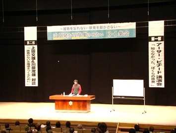 鎌田氏は、放射性廃棄物の処理、再処理工場の稼働の見通しもたたないのに、莫大なお金を原子力産業に注いでいると、菅内閣を批判し、「原発をやめさせ、自然エネルギーに満ちた,平和で明るい社会をつくるために声をあげ続けよう」と訴えました。