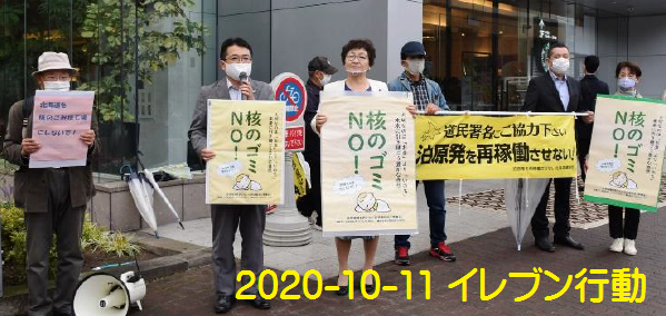 9月13日のイレブンアクションはコロナ対策で中止になりましたが9月27日のチェルノブイリデー行動は実施しました。10月のイレブンアクションでは、野党共闘を広げて原発ゼロの日本を実現すること、核のごみNo!の旗や横断幕をかかげて、核のごみを持ち込ませない町政の実現をめざして奮闘しています。