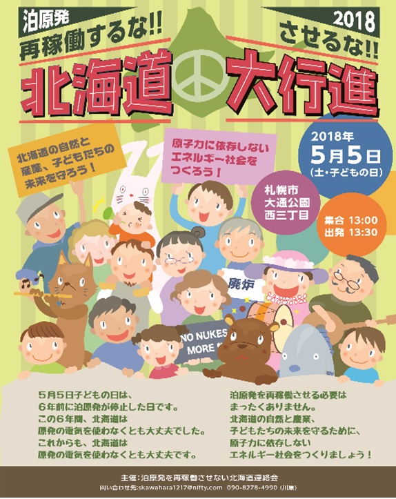 北海道電力泊原発停止から丸6年が経過しました。政府は、2050年に向けた国の長期エネルギー政策を発表し、「原発も主要な選択肢」としています。2018年5月5日は、「泊原発は再稼働するな、再稼働させるな!」の目標をかかげて、北海道大行進(主催 泊原発を再稼働させない北海道連絡会)に参加しましょう。
