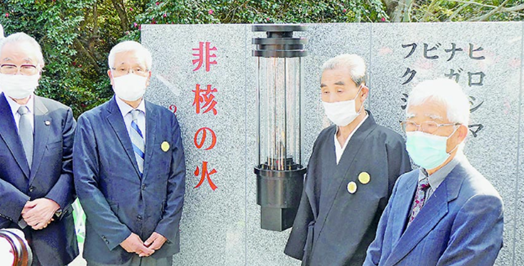 東京・上野で30年間灯し続けた「広島・長崎の火」を引継ぎ、「ヒロシマ・ナガサキ・ビキニ・フクシマ」を結ぶ火として点火されました。宝鏡寺住職の早川篤雄さんは、原発事故で「豊かな自然、平和な暮らし、地域が奪われた」ことから「人類の幸福と進歩は平和なくしては不可能」と強調しました。