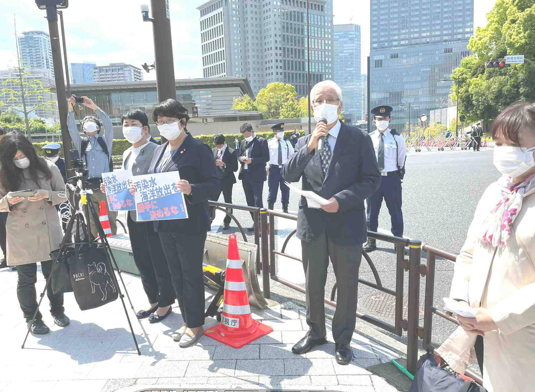 来賓あいさつでは、原発をなくす全国連絡会(全労連副議長)の川村吉伸氏は、岸田政権がコロナ感染症対策に逆行する公立病院の20万床削減と統廃合を強行し、あわせて放射能汚染水の海洋放出も強行しようとしているなかで、国民とともに声をあげようと訴えました。また、原発ゼロ基本法の制定を求めて、20万筆の署名を国会に届け4野党の51人の議員が紹介議員に名を連ねるなど運動を広げてきたことを明らかにし、引き続く運動の展開をよびかけました。さらに福島県会議員の吉田英策氏が地元の議員として挨拶し、ロシアがウクライナ最大の原発施設を攻撃したことは正気の沙汰とは思えないことで、福島県議会でも「核で世界を恫喝するのは許せない」決議したと述べました。また、汚染水の海洋放出には福島県内の28市町村が反対しており、政府は被災者・避難者の救済に、最後まで責任をもてと訴えました。