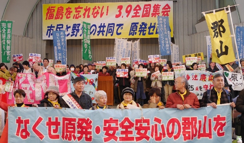 この集会には「戦争させない・九条壊すな! 総がかり行動実行委員会」も協力し、安倍政権と対決し、沖縄・辺野古基地建設反対、沖縄県知事選挙勝利も呼びかけました。さよなら原発1000万署名市民の会の鎌田慧さんは「福島原発事故から7年半が経過したが、原発再稼働を認めない運動をさらに強化しよう」と呼びかけ、澤地久枝さんは「酷い政治が続いているが、原発を許さない思いと沖縄県知事選挙をつなげて、あきらめずに発信しよう」と訴えました。フクシマからの訴えでは、「福島原発訴訟かながわ原告団」の村田弘さんが「東電は地震・津波の対策が必要だとわかっていたのに経営優先で対策を怠った責任を、判決でハッキリさせたい」と支援を訴えました。