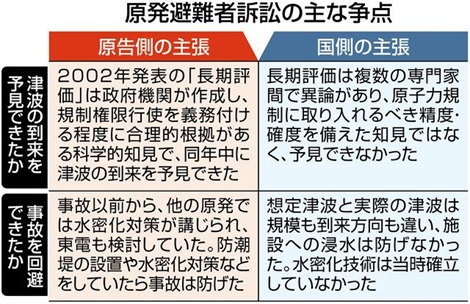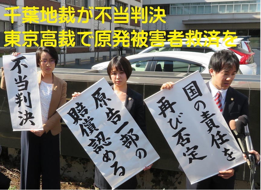 3月16日、福島県の福島市、いわき市、田村市などから東京都に避難した17世帯47人が6億3500万円の損害賠償を求めた裁判で、東京地裁は国と東電の責任を認め17世帯42人に5900万円を支払うよう命じた。 国と東電は、2002年に10メートル超の津波が第1原発を襲う可能性が予見できたのであり、国は2006年までに津波対策を命じるべきで、東電も対策に着手すべきだったと指摘した。
