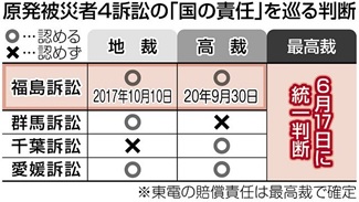 6月17日、最高裁判所第二小法廷(菅野博之裁判長)は、福島原発事故の損害賠償を求める福島、群馬、千葉、愛媛の4県の避難者集団訴訟に対して「国が津波対策を命じていても事故は防げなかった可能性が高い」として、「原発事故における国の責任を認めない」判決をくだした。
