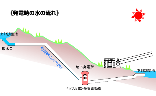 揚水発電 揚水発電施設は、上ダムと下ダム、そして発電施設で構成されます。自然再生エネルギーの発電量が過剰な時間帯や、需要が少ない時間帯に、余剰電力を利用して下ダムから上ダムに揚水し、需要が高くなる時間帯に上ダムに溜まった水を放流し発電します。水の位置エネルギーを電気エネルギーに変換するシステムであり、文字通りの蓄電池です。
