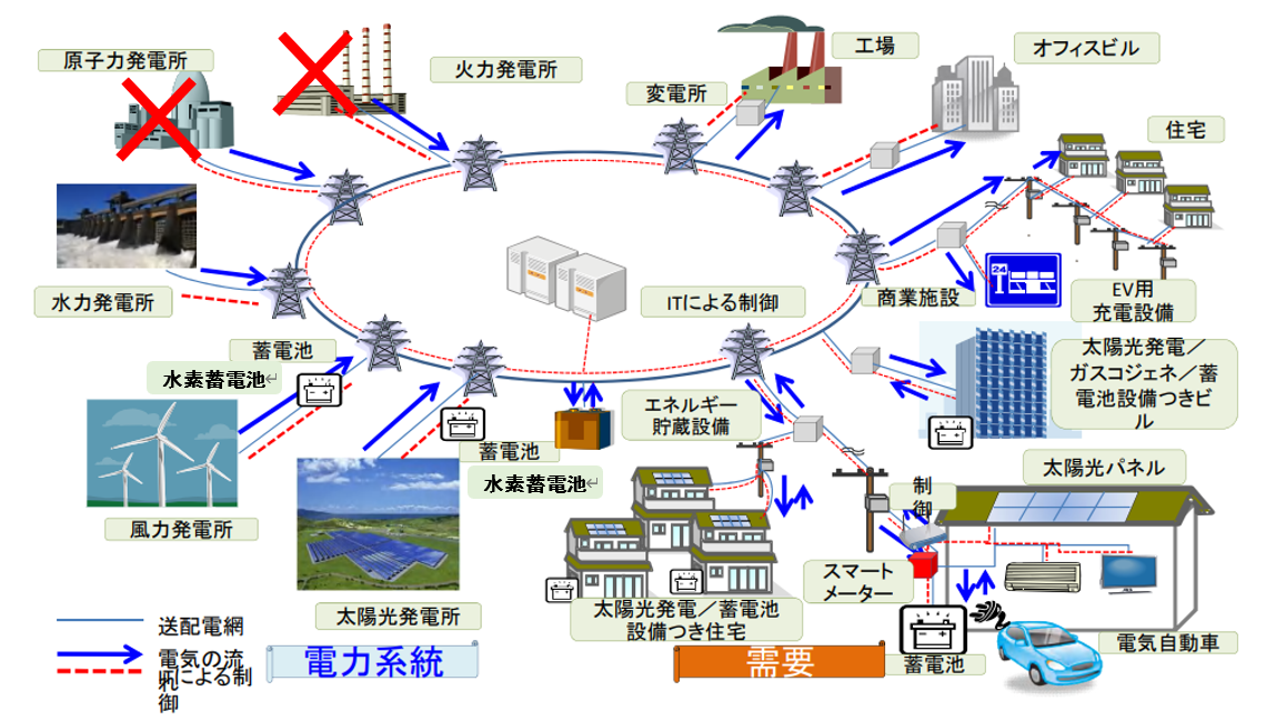 電力は、発電量と使用量がバランスしないと発電に不具合が生じ、最悪の場合、大規模停電が起こります(同時同量の原則)。太陽光発電は、季節・昼夜・晴天/雨天などで、発電量が変化します。風力発電も同様です。これらの変動を調節し、安定供給するため、現在は火力発電や原子力発電などに頼っています。しかし、以下の理由などにより退場してもらわなければなりません。