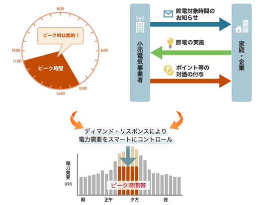 DR(要求応答):電力需給を調整するための仕組みを言います。電力の供給と消費に関し、消費者と電力会社はリアルタイムでやりとりし、消費者(家庭、企業、工場など)の需要がピークに達する前、あるいは発電側の供給が逼迫している時に、電力消費を減らしたり(節約)、消費者が発電し使いきれなかった余剰電力を電力網に売ったりできます(「ピークシフト」や「バーチャル発電所」など)。これにより、電力ネットワークが安定し、エネルギー供給の効率が向上します。