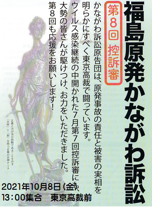 福島原発かながわ訴訟第8回控訴審は、2021年10月8日(金)13時 東京高裁前集合で取り組まれます。大勢の皆さんの傍聴支援をお願いします。
