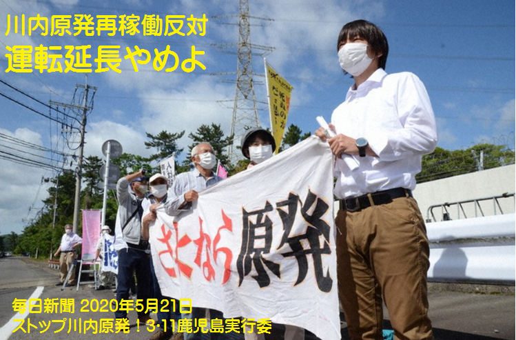 鹿児島県の川内原発1号機と2号機が特定事故等対処施設(テロ対策施設)建設が、設置期限の2020年5月21日に間に合わず運転停止になった。5月20日には「ストップ川内原発!3・11鹿児島実行委員会」は集会をおこなって、再稼働.運転期間延長反対を訴えた。
