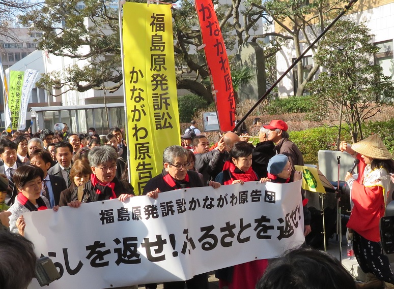 3月22日、原発事故発生の地元にある福島地裁いわき支部は、福島原発避難者訴訟の第一陣原告(77世帯・219人)が、東電に対して①避難慰謝料(月額50万円)②故郷喪失慰謝料(一人2000万円)③居住用不動産(再取得価格)④家財(再取得価格)など総額133億円の損害賠償を求めた裁判で、福島地裁いわき支部は、東京電力の賠償責任を認めた。さらに、被害者の生活再建のために必要な追加的費用を政府の中間指針の賠償金に上積みする賠償を命じた