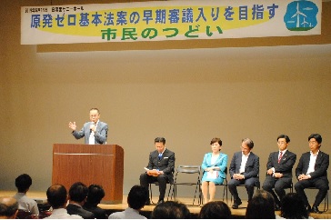 こ集会のメインスピーカーとして発言した原自連の吉原毅さん(城南信用金庫顧問)は、原発ゼロの基本法案についてわかりやすく説明し、「電力会社もつぶれない、立地地域の経済も困らない、困るのは原発の利権にまみれた一部の人達だけ。基本法案の実現に向け世論を盛り上げましょう。」と訴えました。