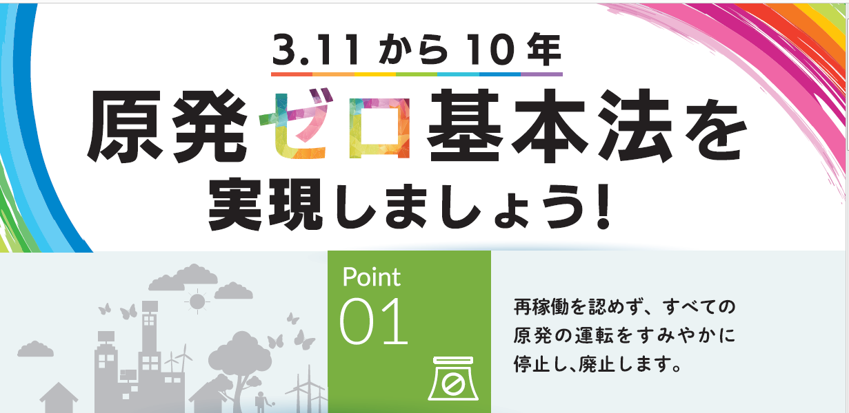 東京電力福島第一原発事故から10年が経過しました。福島原発の事故を検証し教訓を学び、原発事故の被災者と被災地にたいして、国と東京電力は速やかに損害賠償の責任を果たすべきです。地震や洪水などの自然災害が多い日本では、原発の危険はとりわけ甚大です。