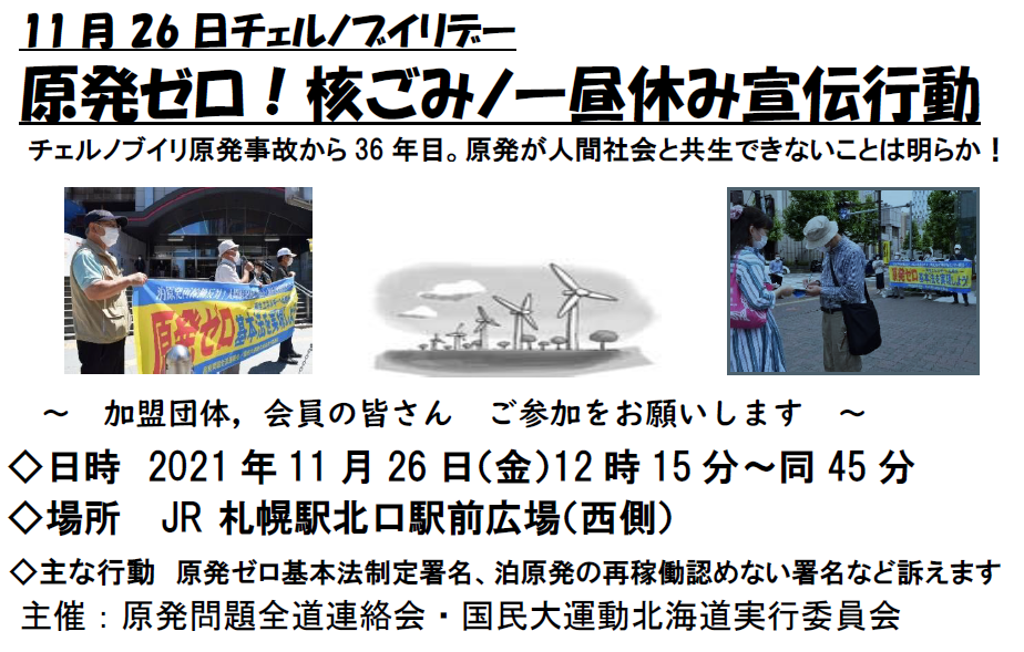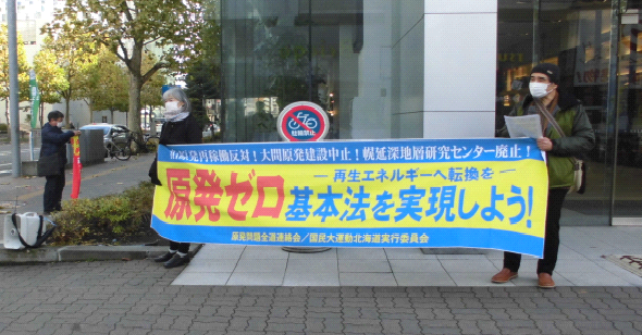 11月11日、北海道では岸田政権のもとで初めてのイレブンアクションを実施しました。福島第一原発事故を繰り返させないために横断幕とのぼり旗を掲げて、リレートークで訴えました。